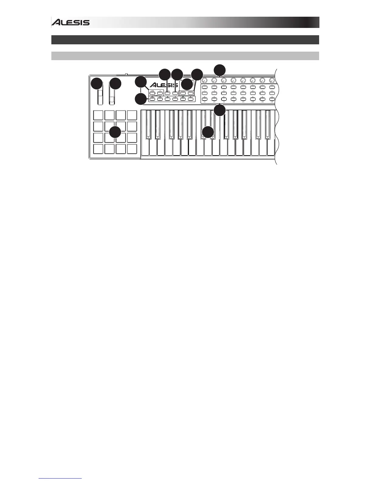 7. Pads : Ces pads permettent de déclencher des sonorités de batterie ou d’autres échantillons