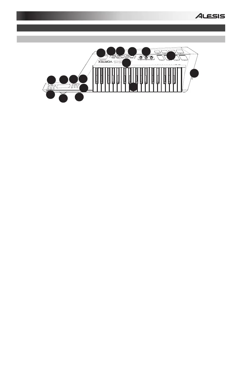 1. Touche Sustain – Lorsque cette touche est enfoncée, toutes les notes jouées sur le Vortex seront maintenues jusqu’à
