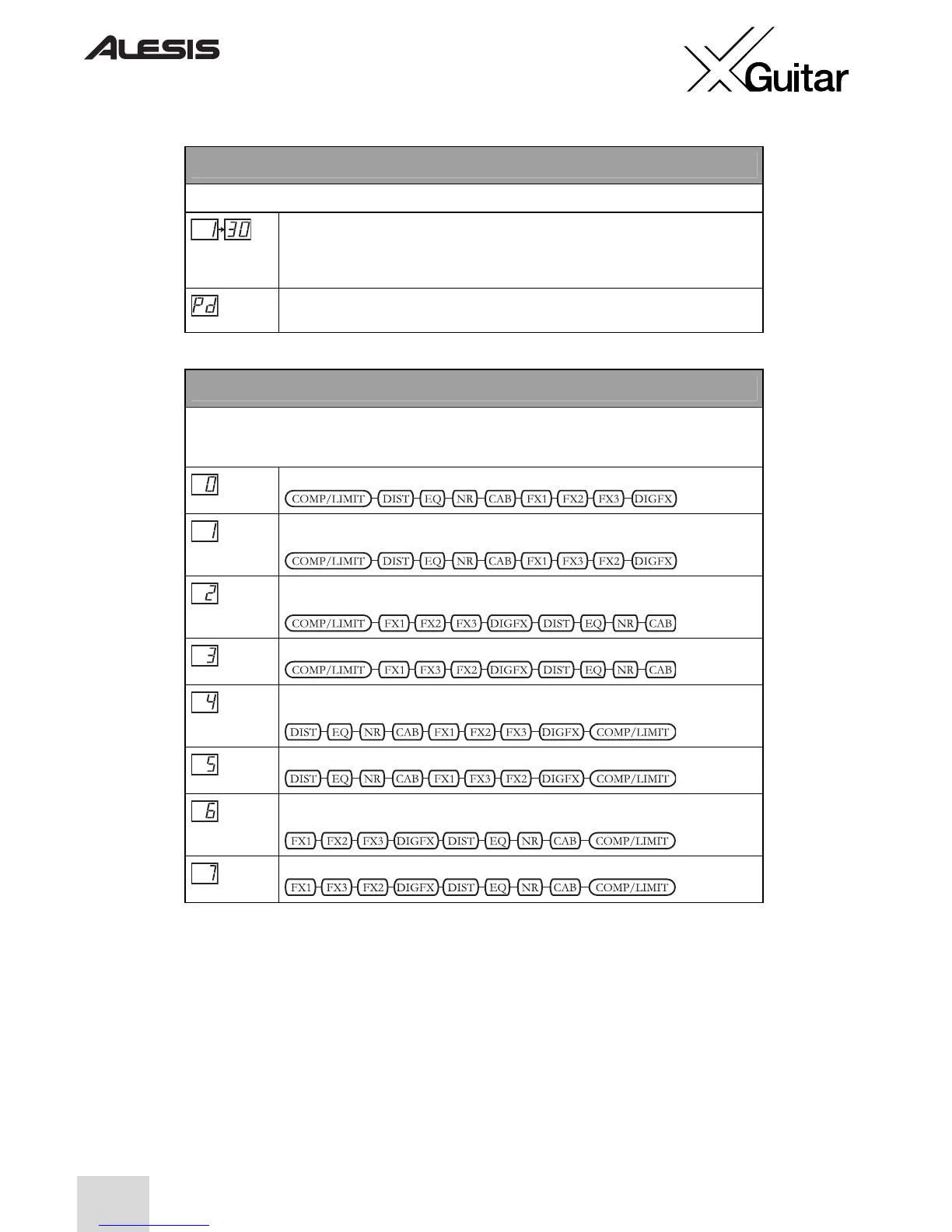 Dans ce mode, l'écran d’affichage indique l'ordre d’acheminement du signal des modules FX en cours.