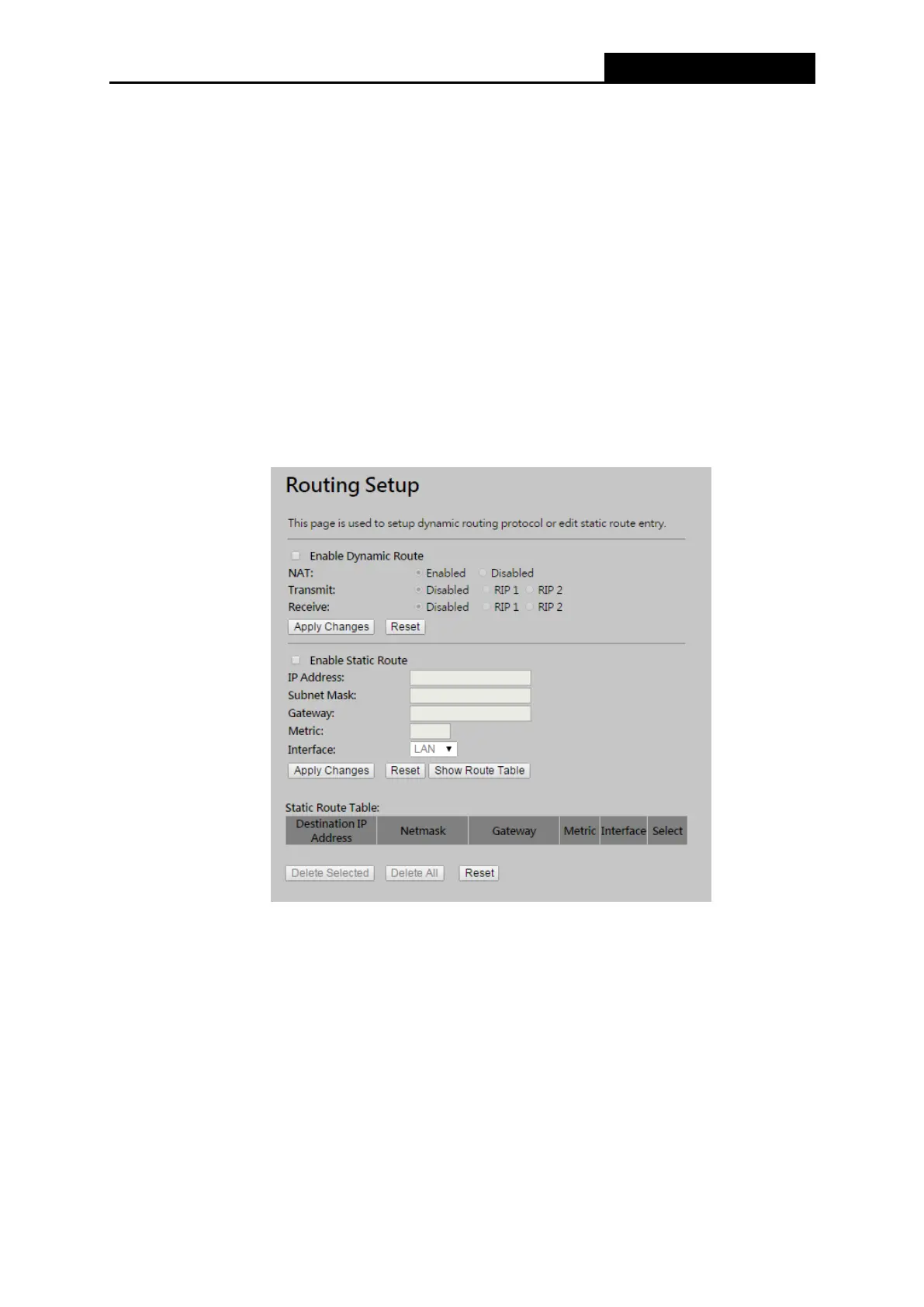 Static Routing table It only shows the static routing table and you can delete one or all.