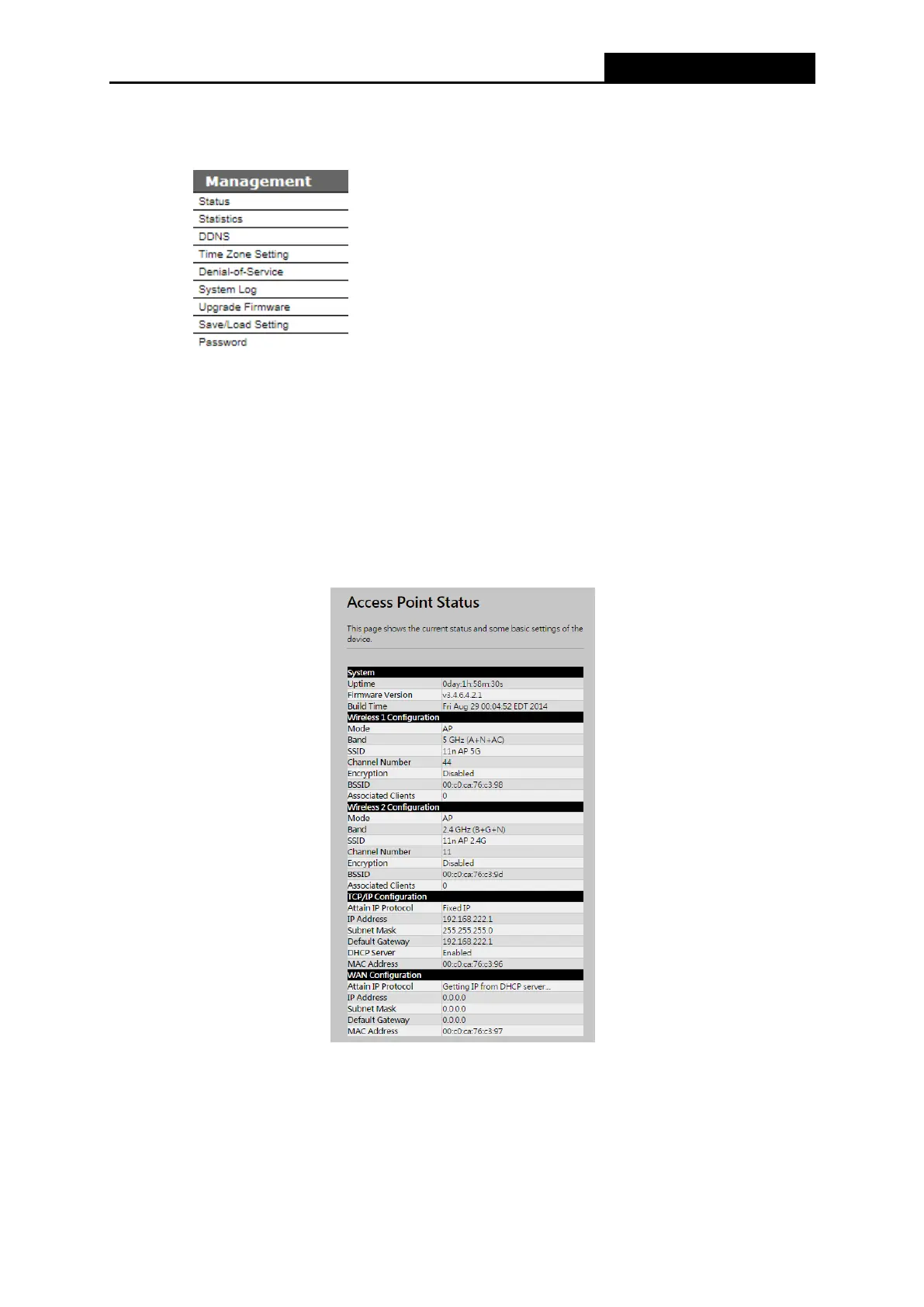 Choose menu “Management → Status”, display the current status of AC1200R as shown in