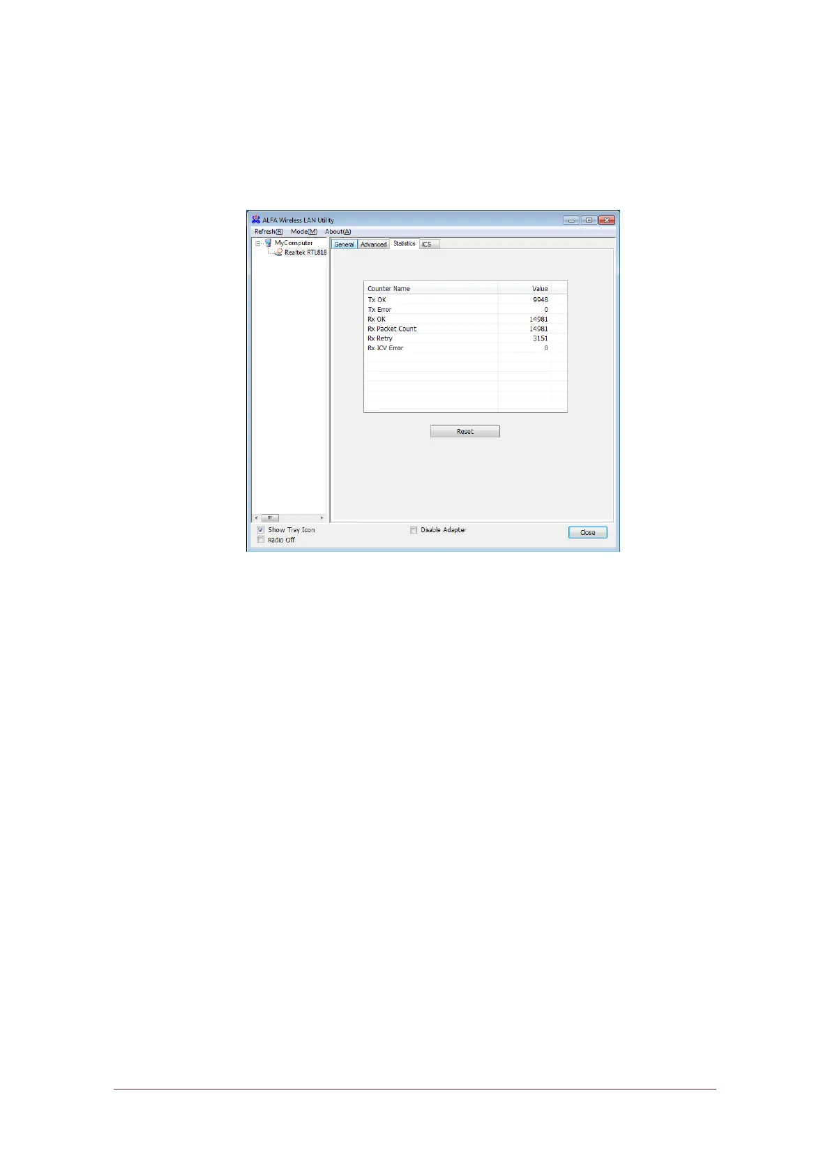 The “Statistics” tab shows the transmission activity record. Clicking the “Reset”