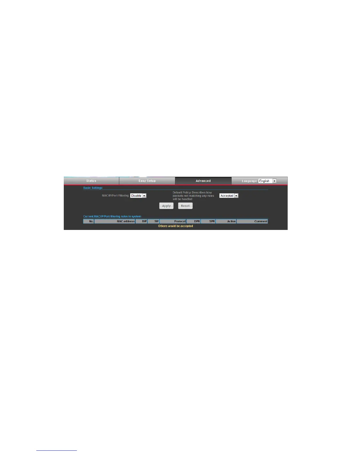 ◆ Default Policy — When MAC/IP/Port Filtering is enabled, the default policy will be