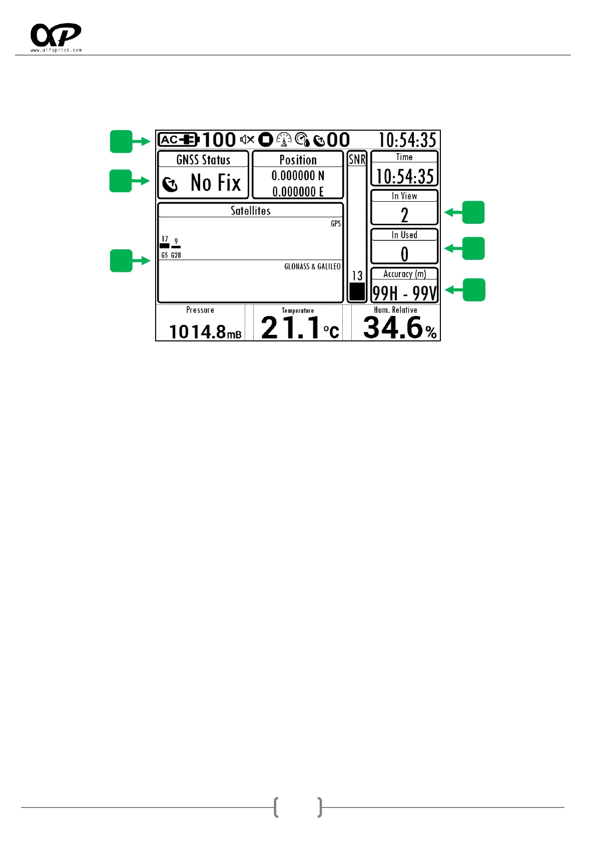 It shows information and icons related to the status of sensors, battery charge, numbers of satellites in use,