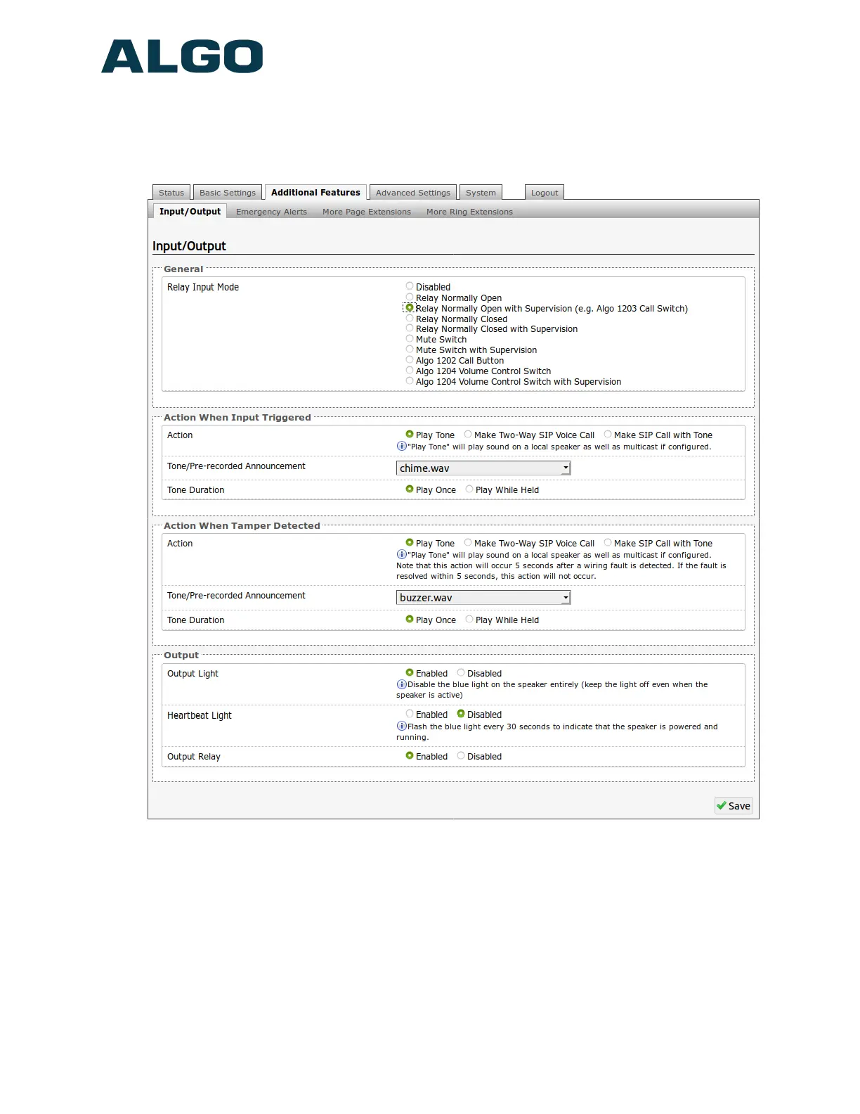 Additional Features Tab – Input/Output