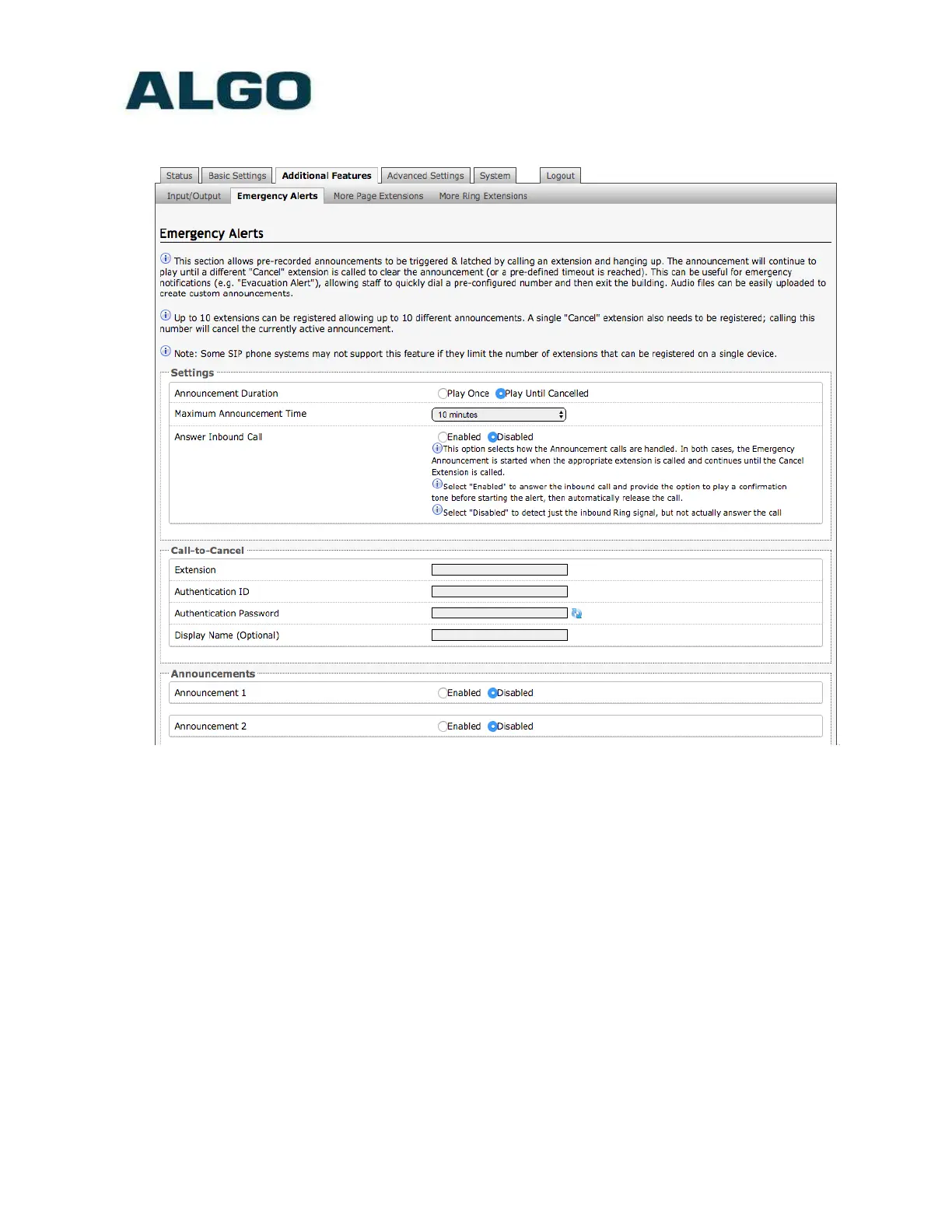 Additional Features Tab – Emergency Alerts
