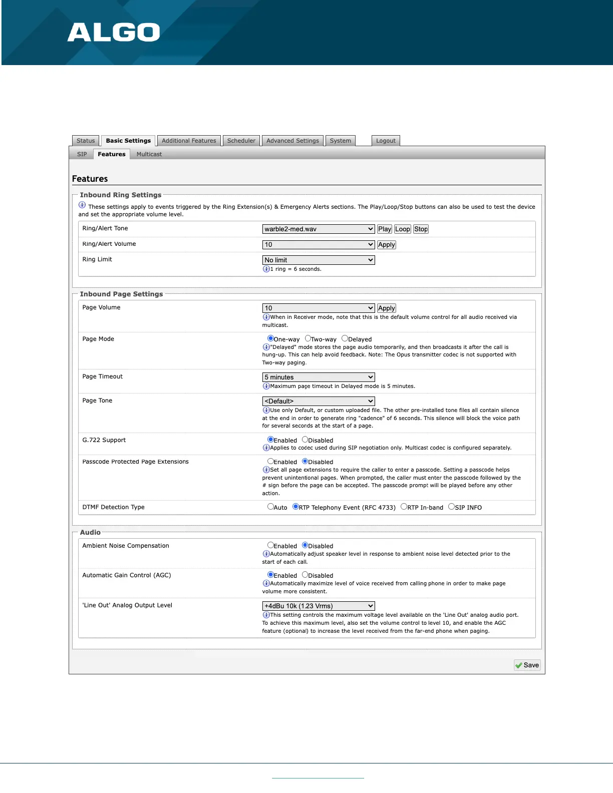 Algo 8301 - Features; Figure 14: Basic Settings Features