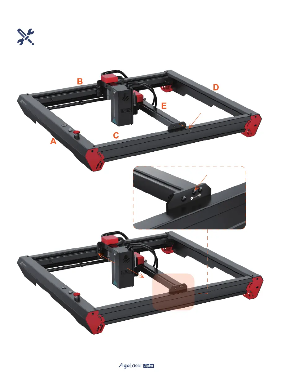 Step 13: Install a screw on E (X-Axis Assembly), tighten the screw until the belt is properly tightened (this means