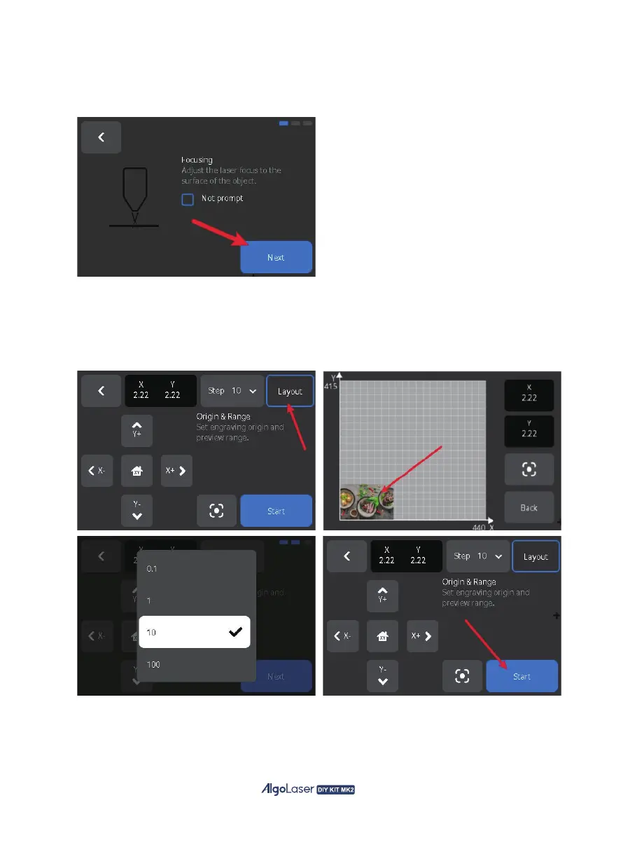 Engraving area: Use the screen button to move the laser position, and "Step" to adjust the moving