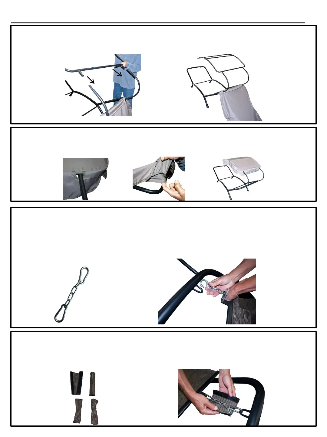 Locate the 4 hanging chains with lock hooks (Part N). Also locate the hammock bed with attached