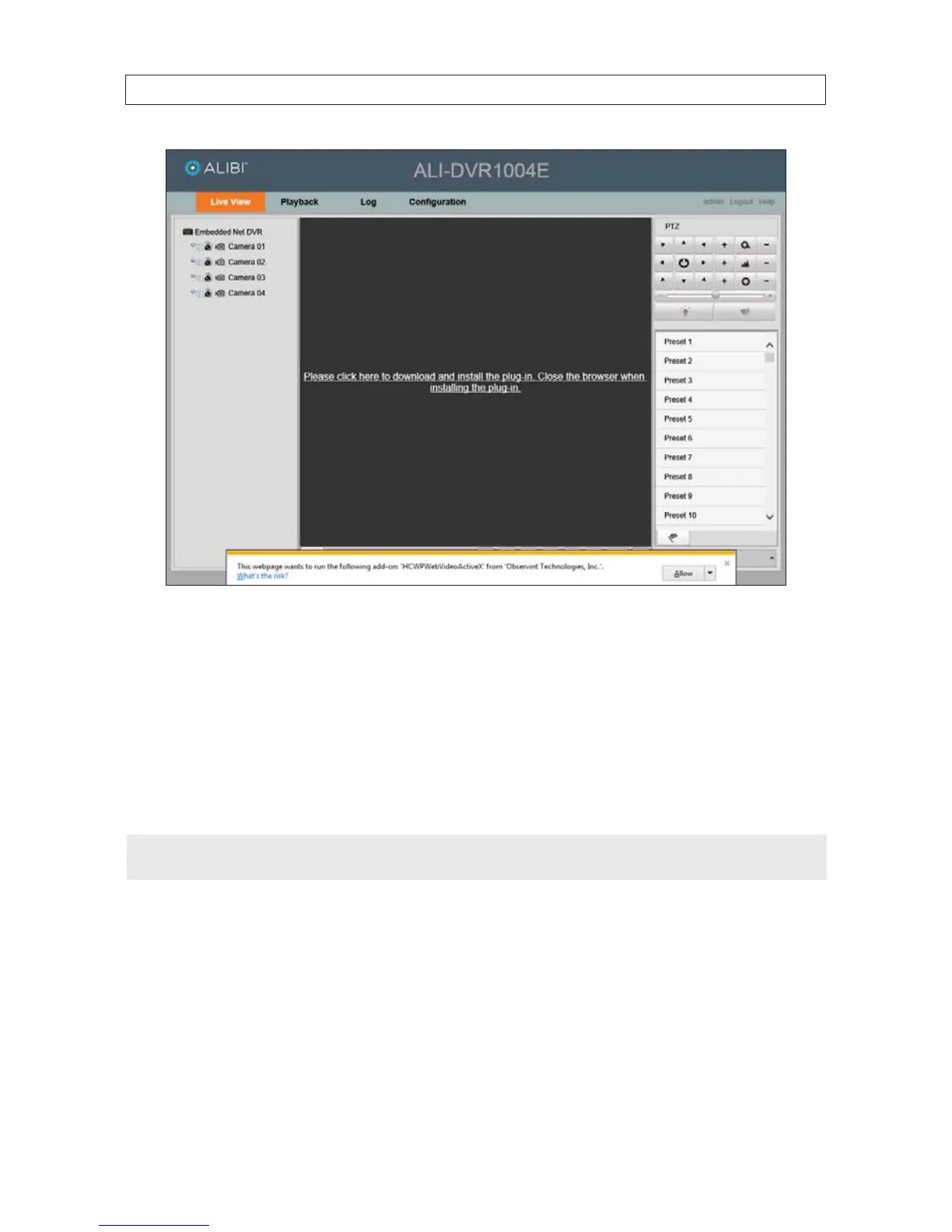 The Live View screen initially appears in a 2*2 channel viewing frame conguration with no live view images shown. You can: