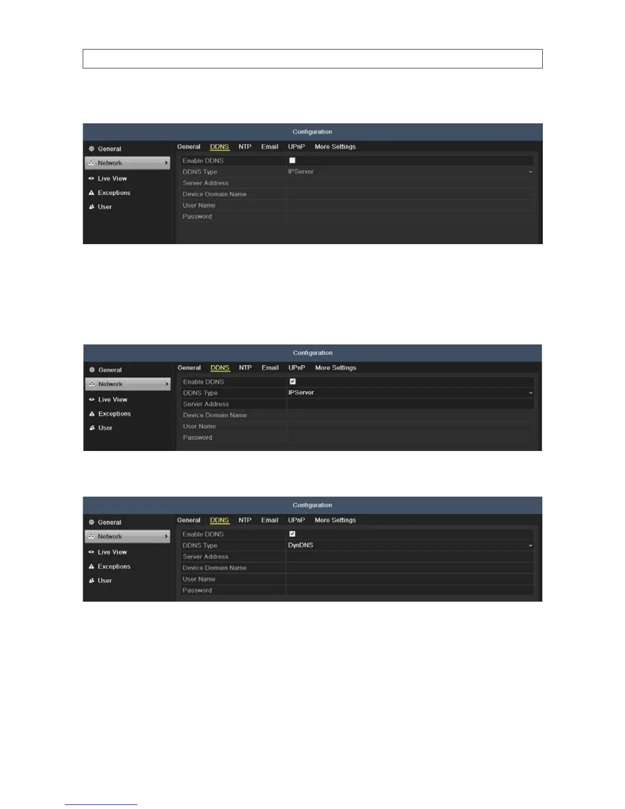 4. Open the DDNS Type drop down list and select one of ve options: IPServer, DynDNS, NO-IP.