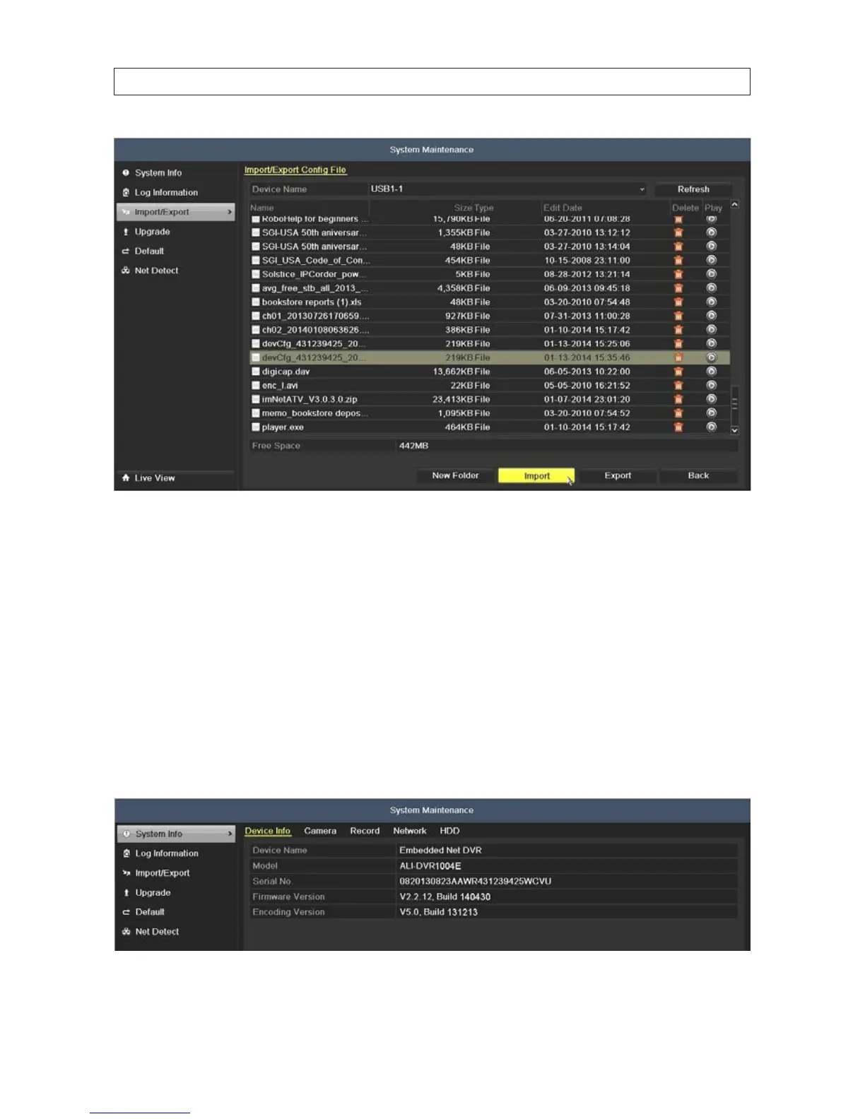 2. In the le list of the USB device, highlight the DVR conguration le you want to load, and then click Import.