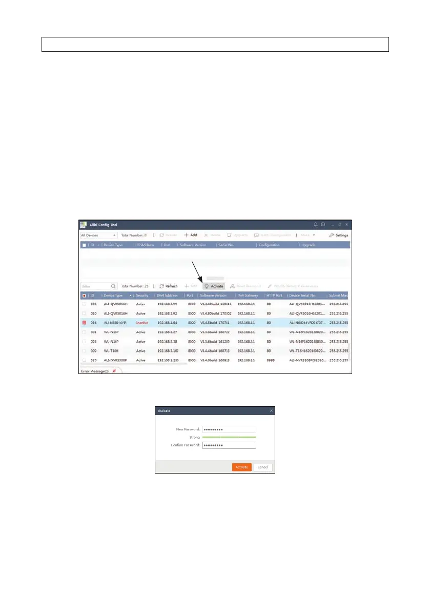 In the example below, an ALI-NS8014VR camera is activated and congured for its network. The procedure is similar for all other