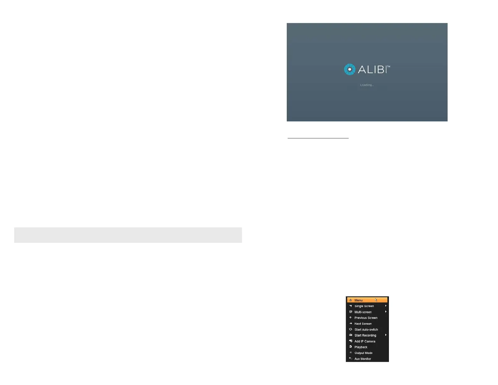 Power on the NVR. Normally, an Alibi logo splash screen appears within 2 minutes.