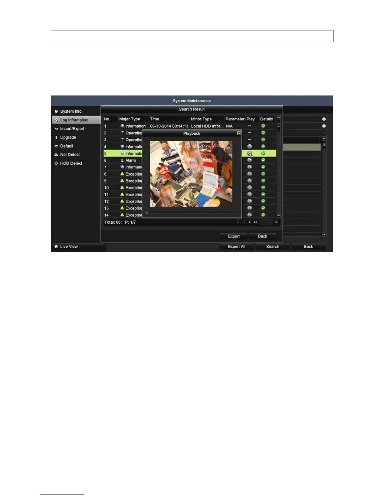 Log information can be exported to a backup device such as a USB storage device. The exported log le is in .txt format and readable