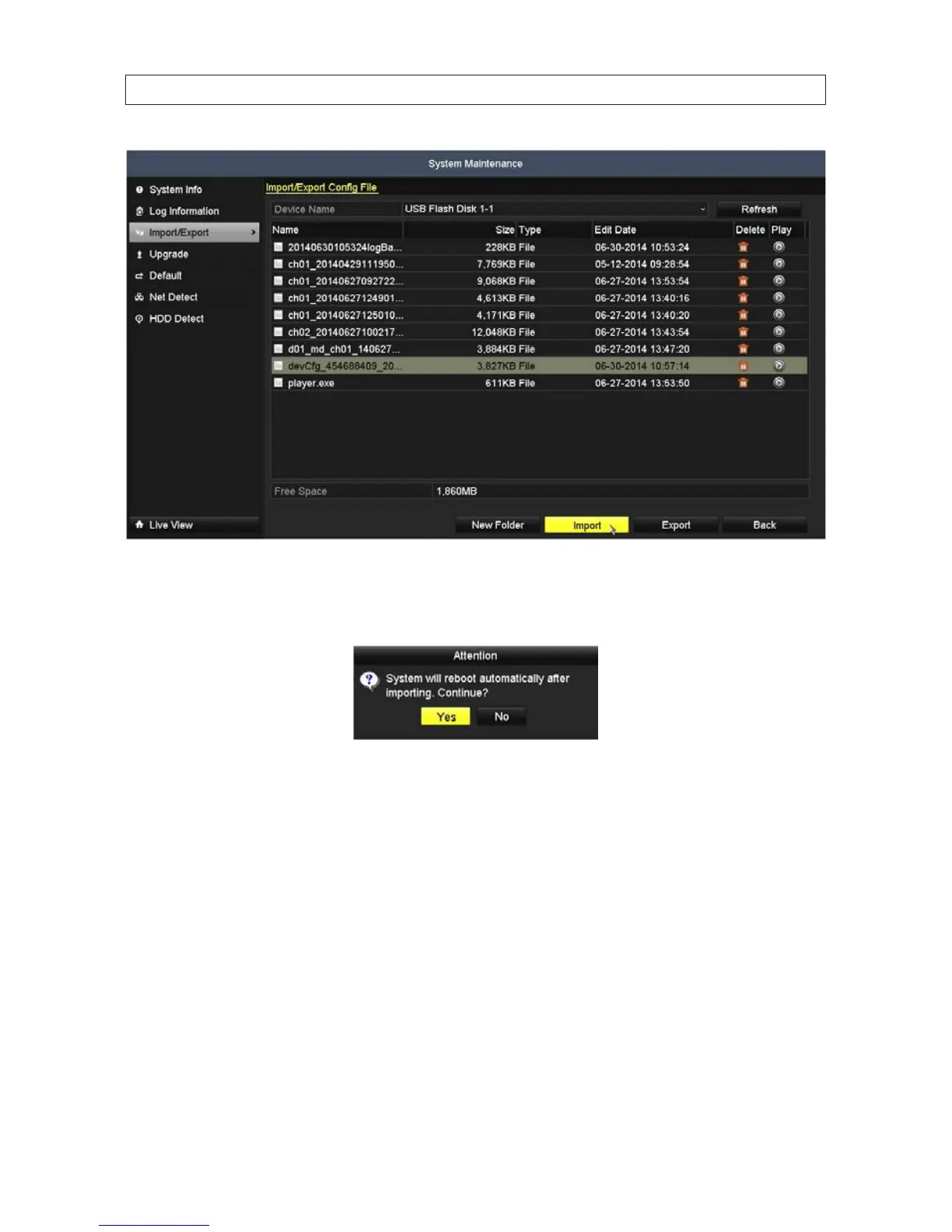 3. In the le list, highlight the NVR conguration le you want to load, and then click Import.