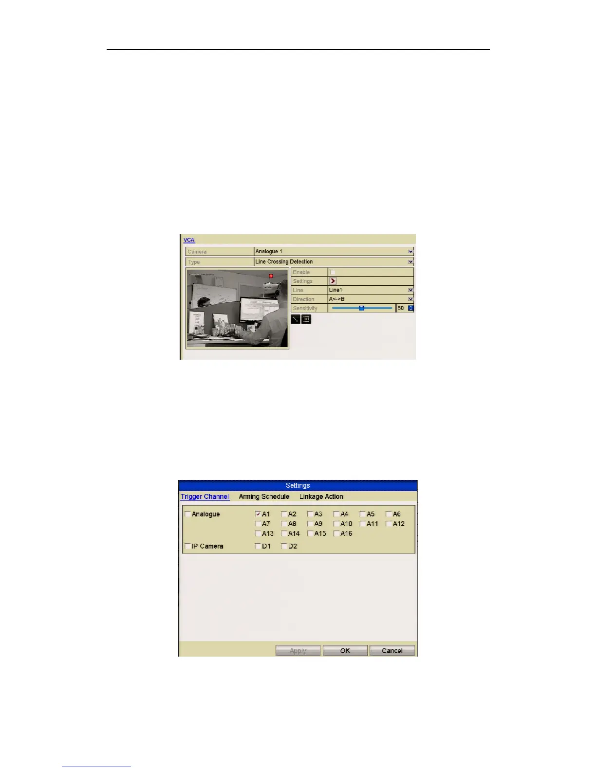 The DVR supports the VCA (line crossing detection and intrusion detection) triggered