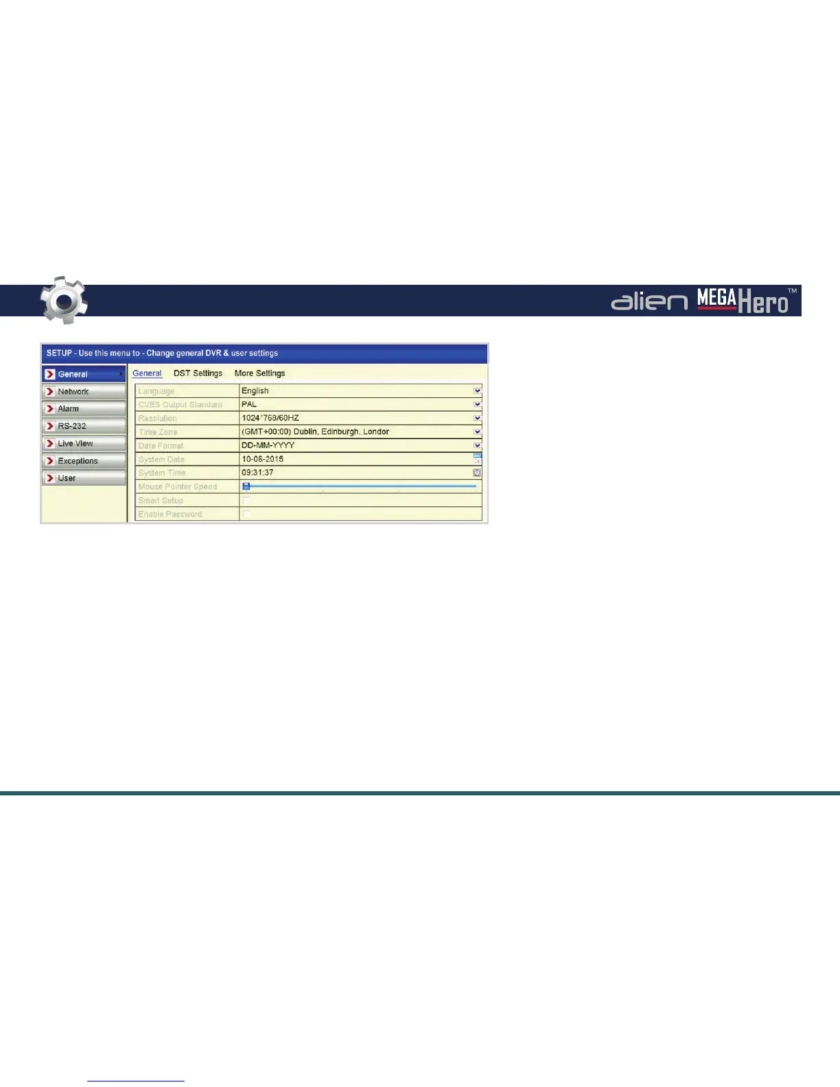 outputs, RS232 settings and exceptions (such as a full HDD) and user accounts.