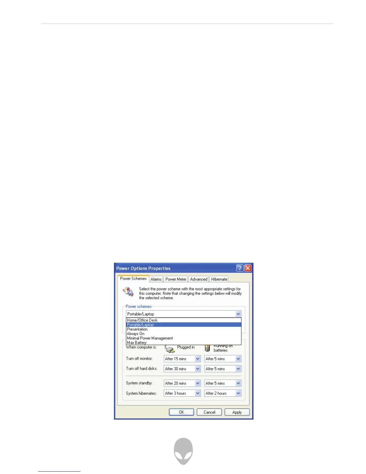Options Properties [Start > Settings > Control Panel > Power Options] dialogue box, you may