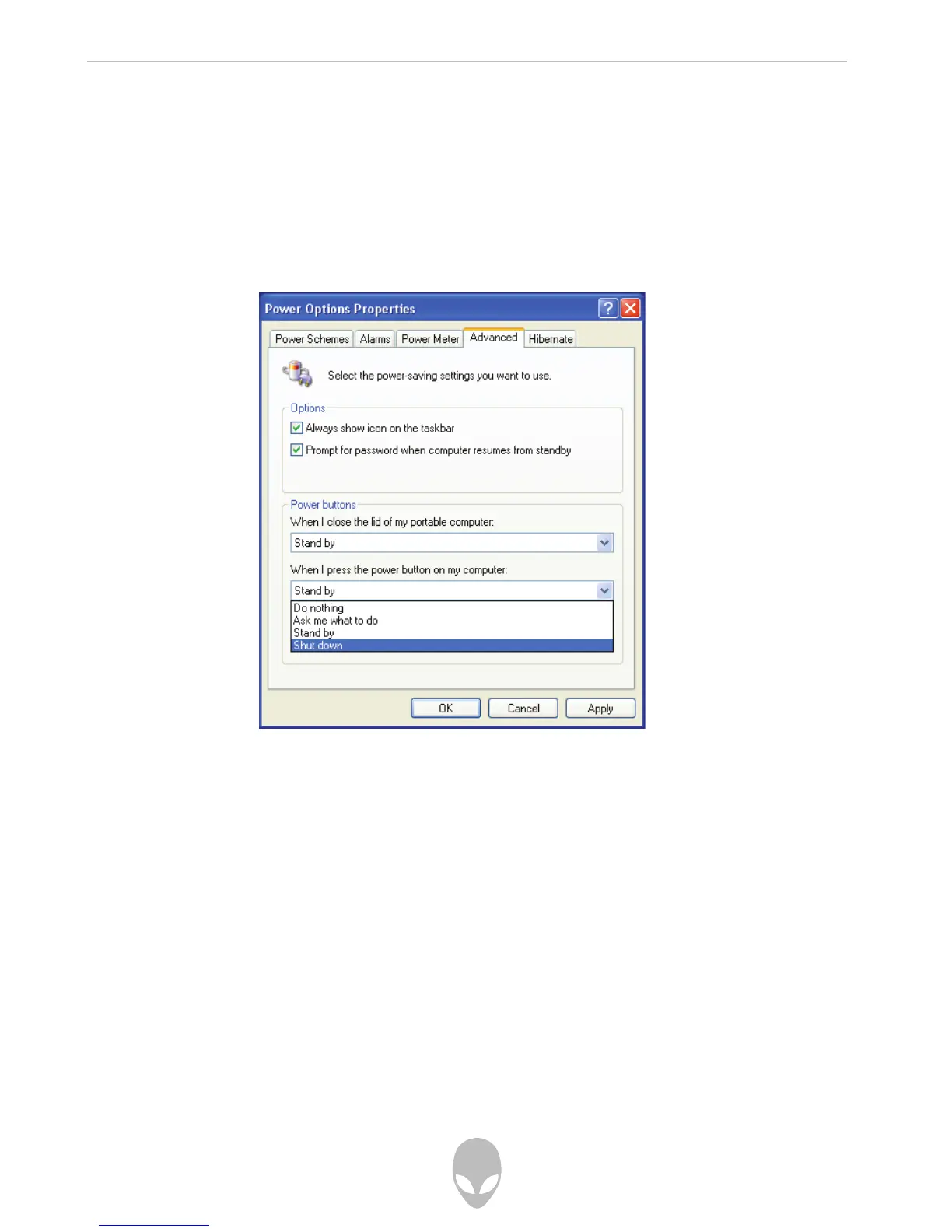Go to [Start > Settings > Control Panel > Power Options] and click on the Advanced tab.