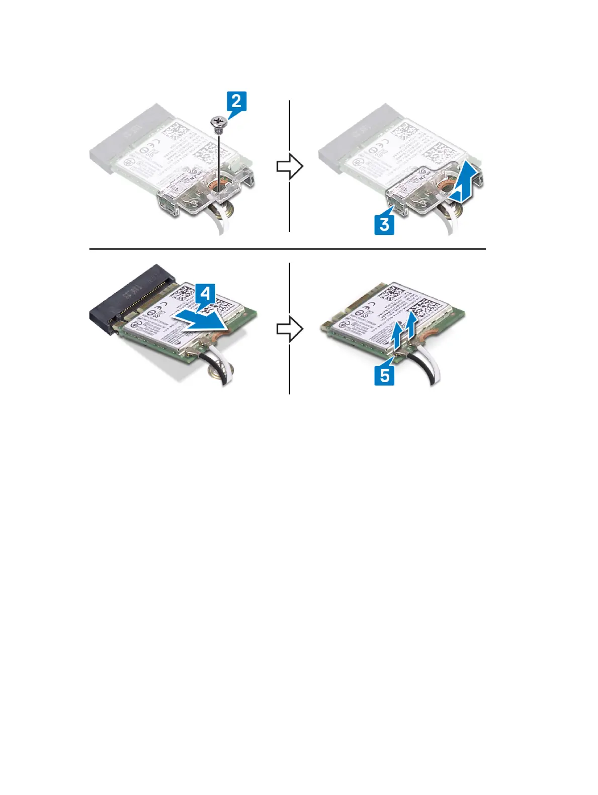 5 Disconnect the antenna cables from the wireless card.