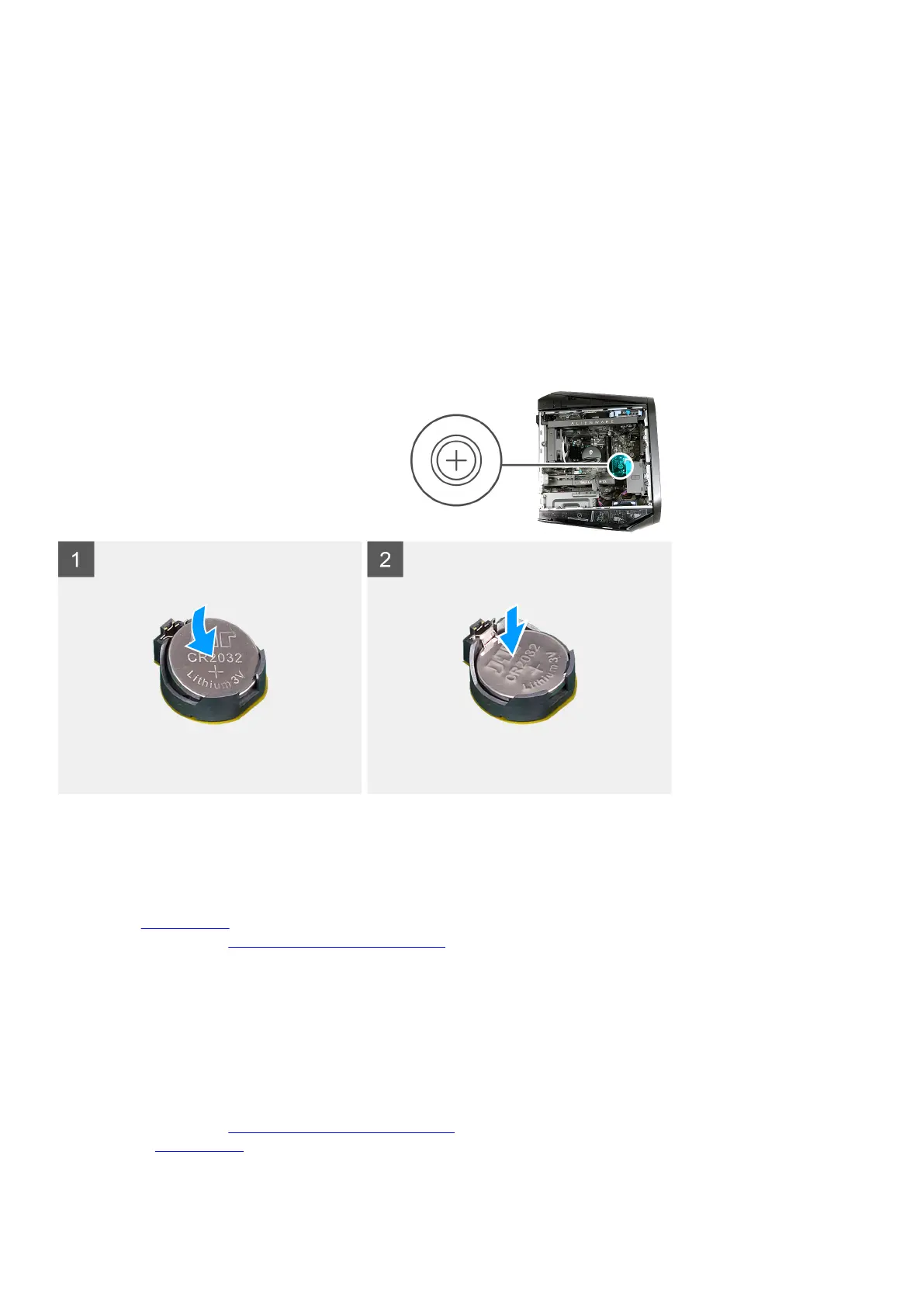The following images indicate the location of the coin-cell battery and provide a visual representation of the installation procedure.