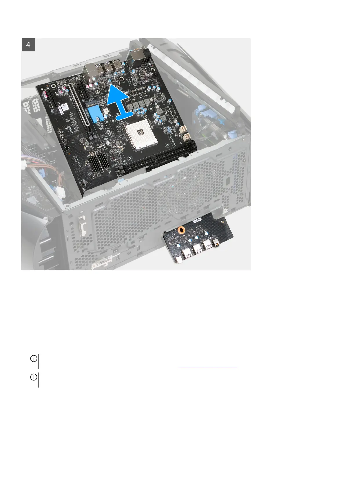 11. Hold the edge of the system board where the front I/O-ports are located.