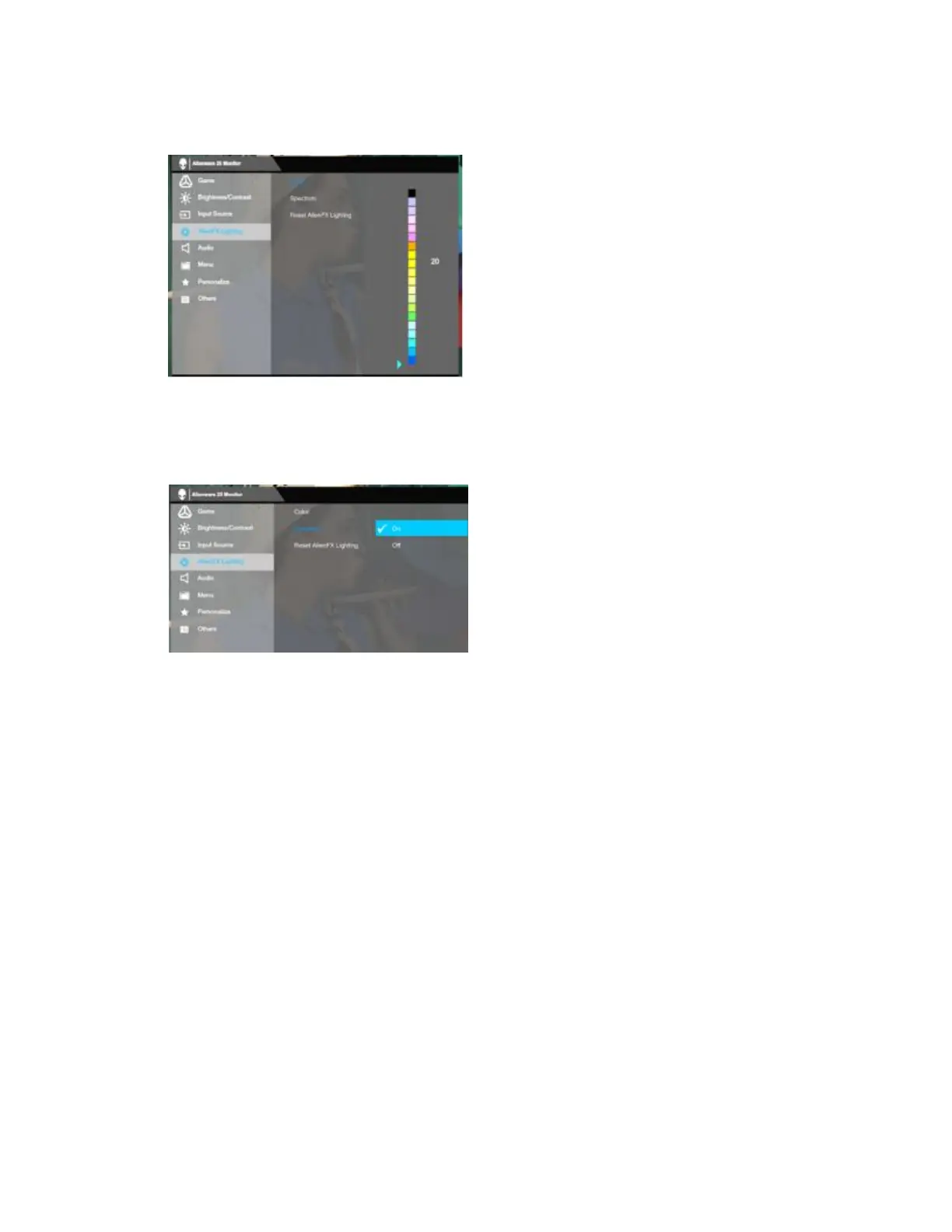 Go to the OSD menu ->AlienFX Lighting ->Spectrum ->Select "On". (Figure 6.)