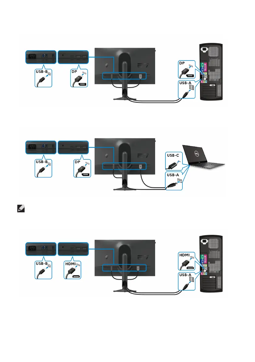 Alienware AW2724HF - Connecting the Displayport (DP to DP) and USB Cables; Connecting the Displayport (USB-C to DP) and USB Cables; Connecting the HDMI and USB Cables (Optional)