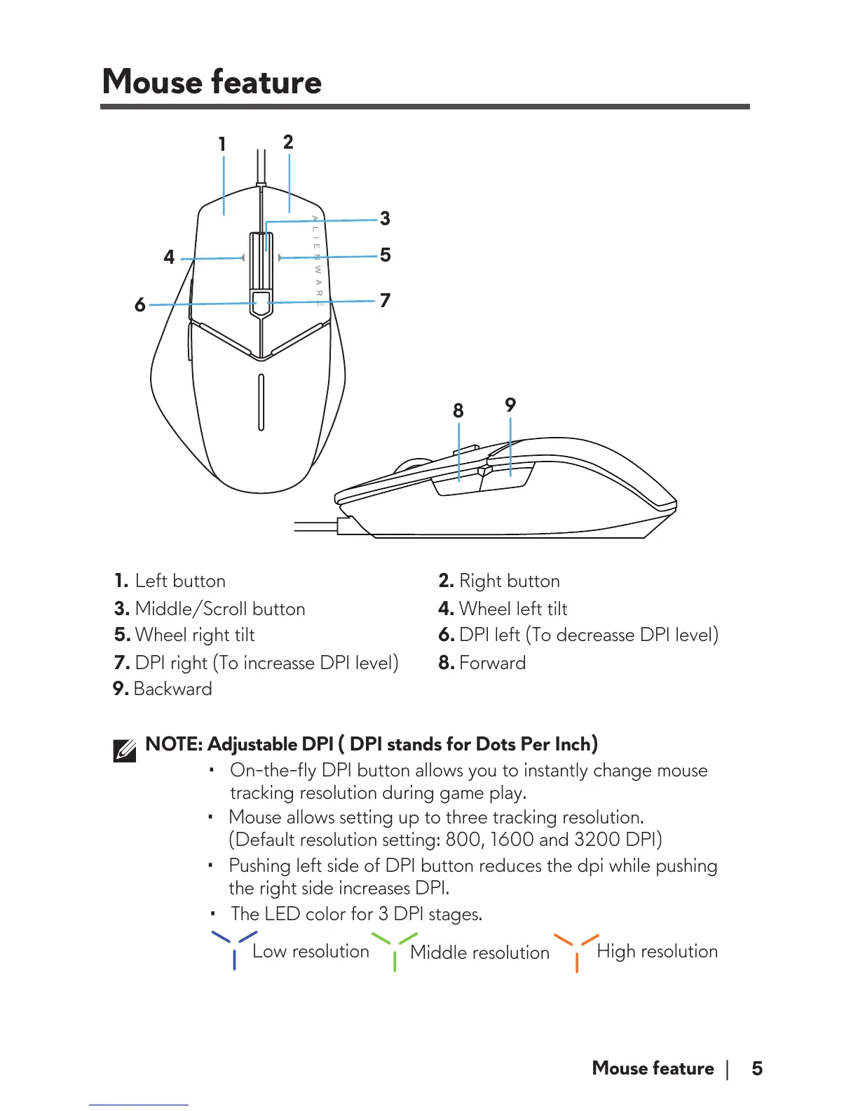 7. DPI right (To increasse DPI level) 8. Forward