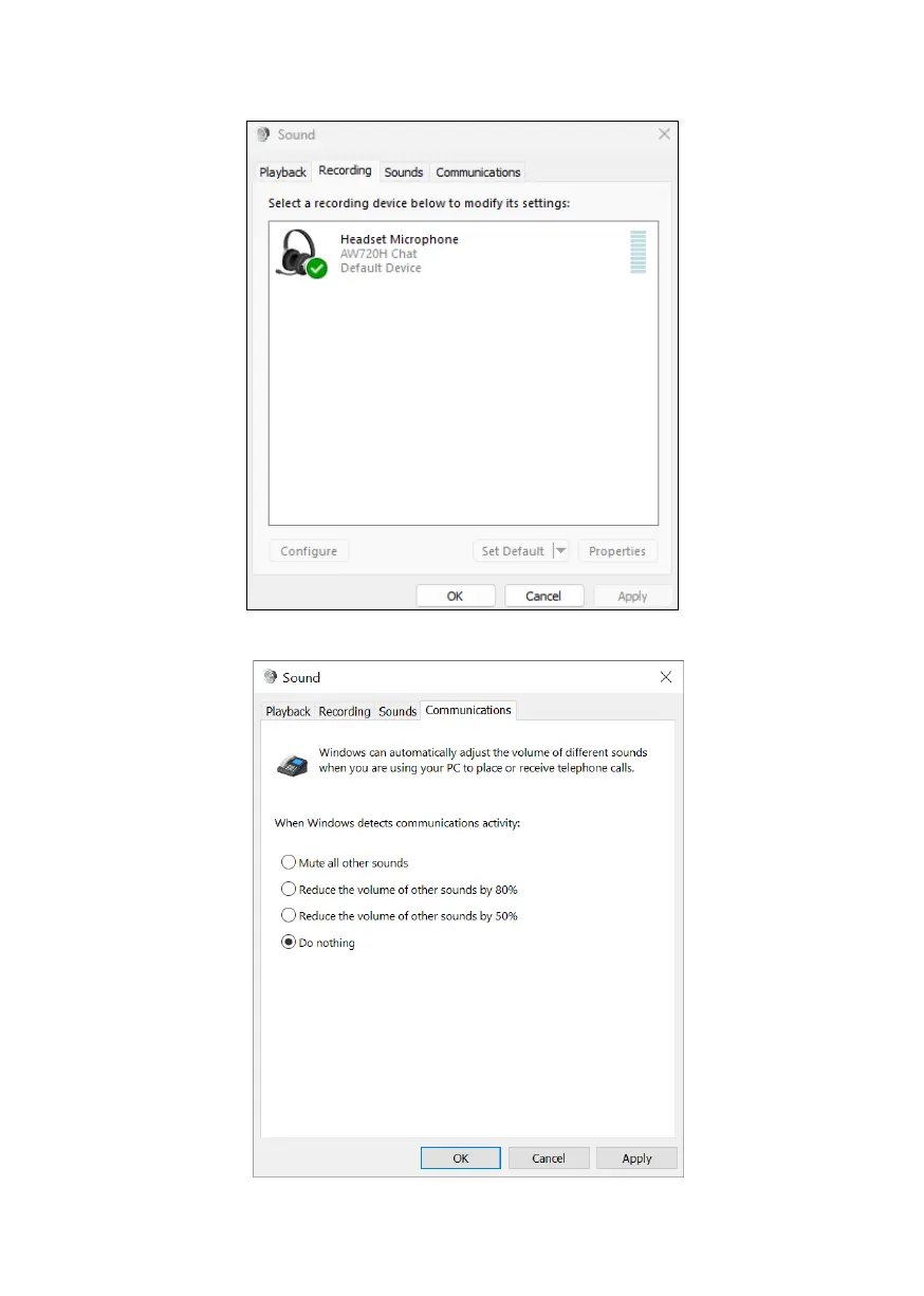 3. Click the Recording tab, set Alienware AW720H Chat as the default device.
