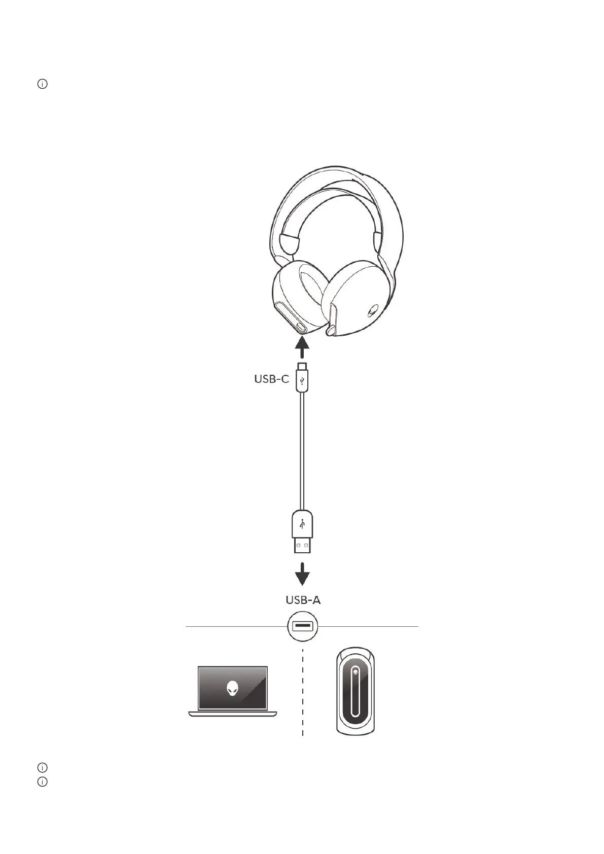 To charge the headset, connect on one end of the USB-A to USB-C cable to the USB-C port on your headset. Connect the USB-A