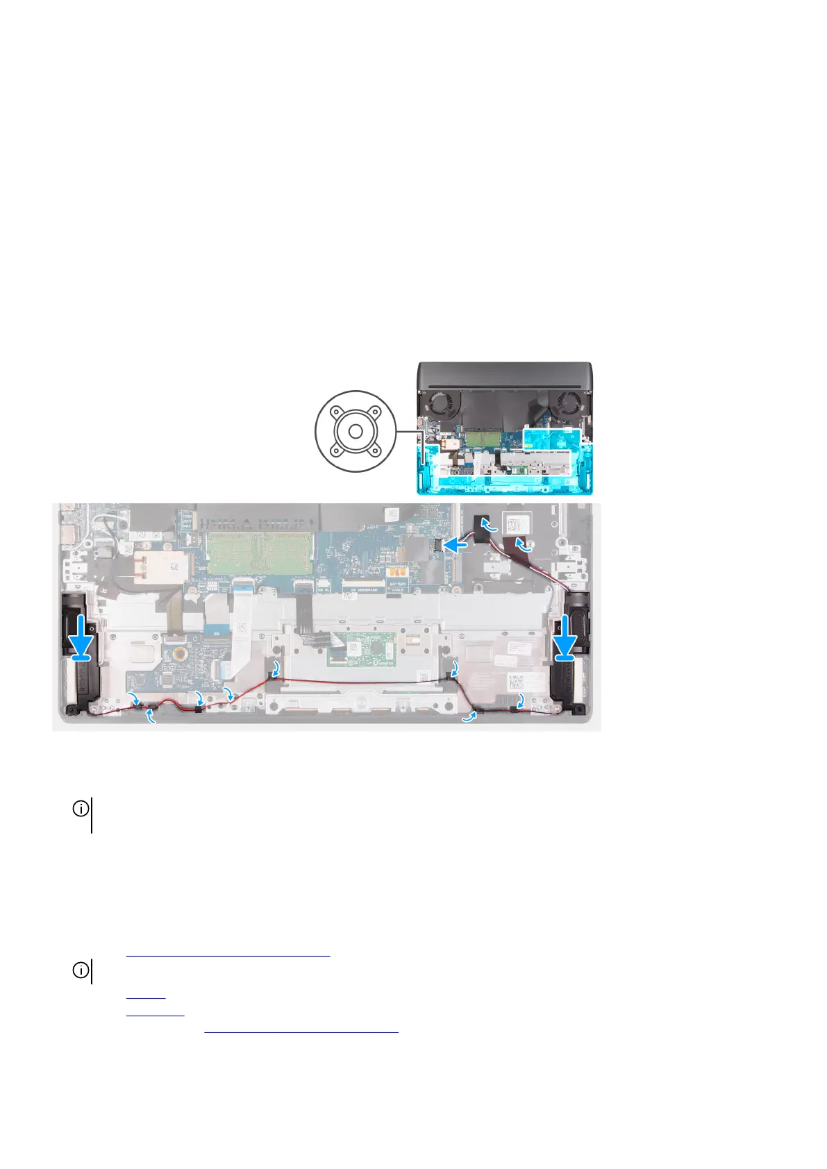 2. Route the speaker cable through the routing guides on the palm-rest and keyboard assembly.