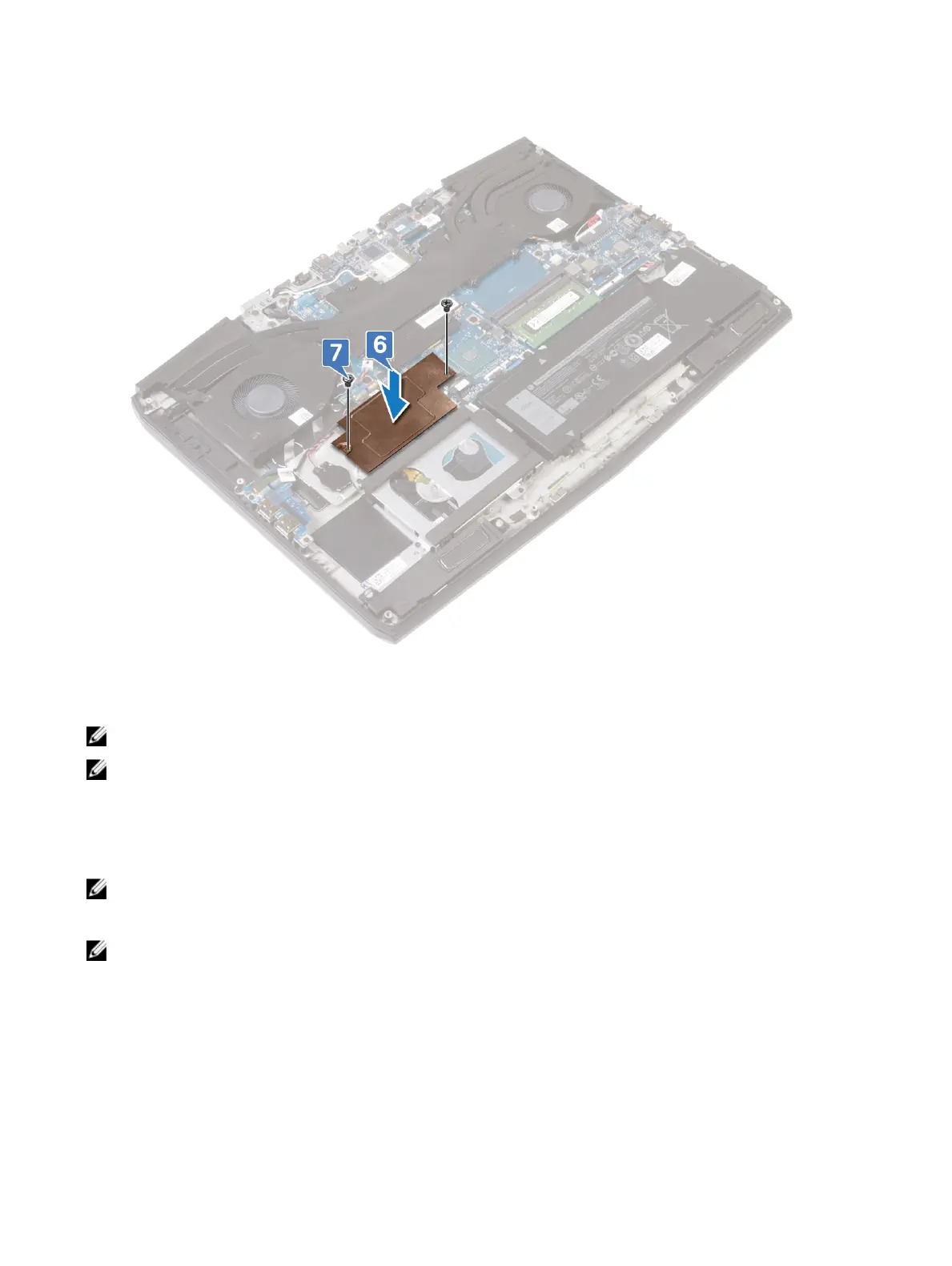 7 Replace the two screws (M2x3) that secure the M.2 thermal shield to the palm-rest assembly and system board.