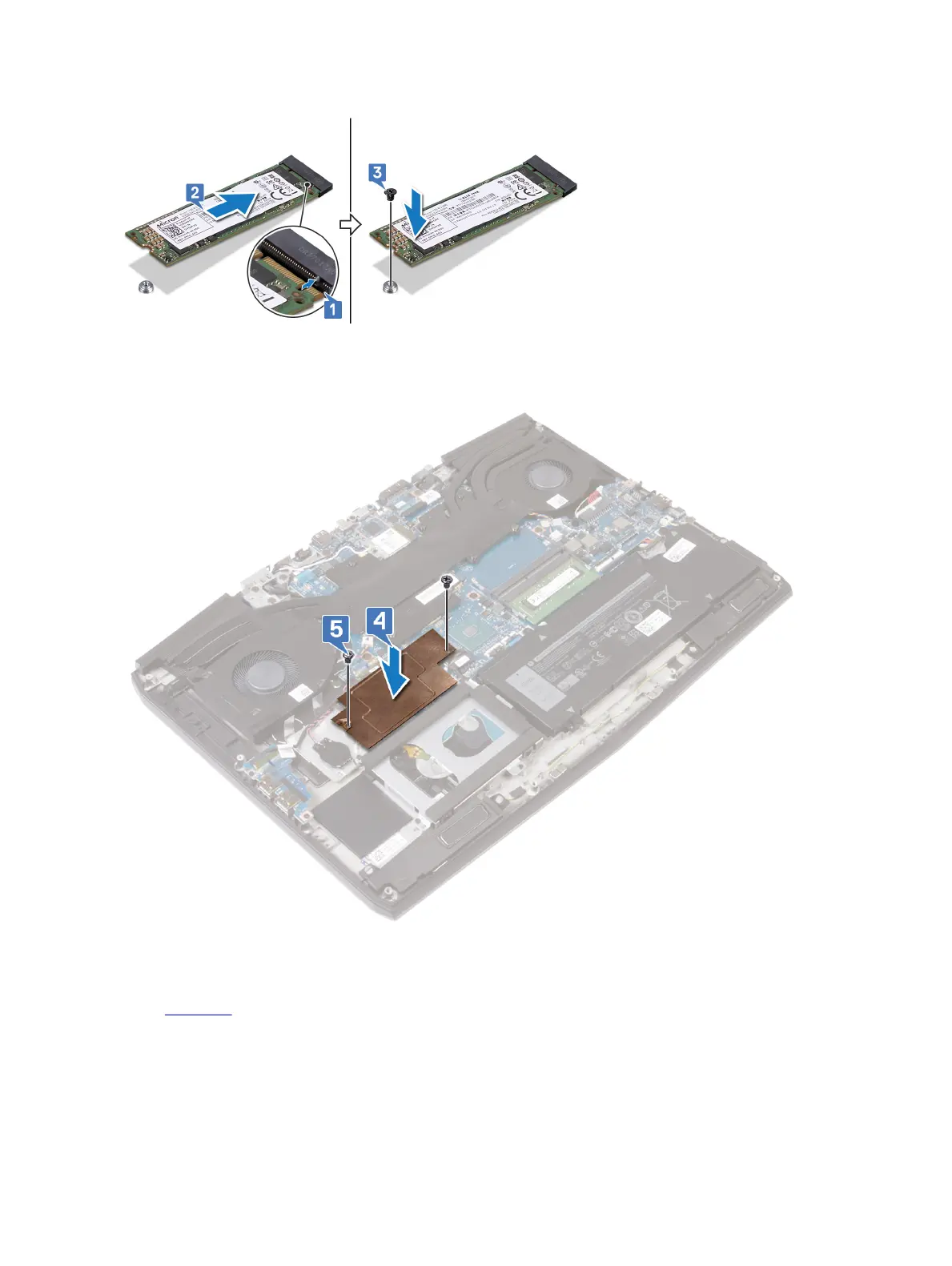 5 Replace the two screws (M2x3) that secure the M.2 thermal shield to the palm-rest assembly and system board.