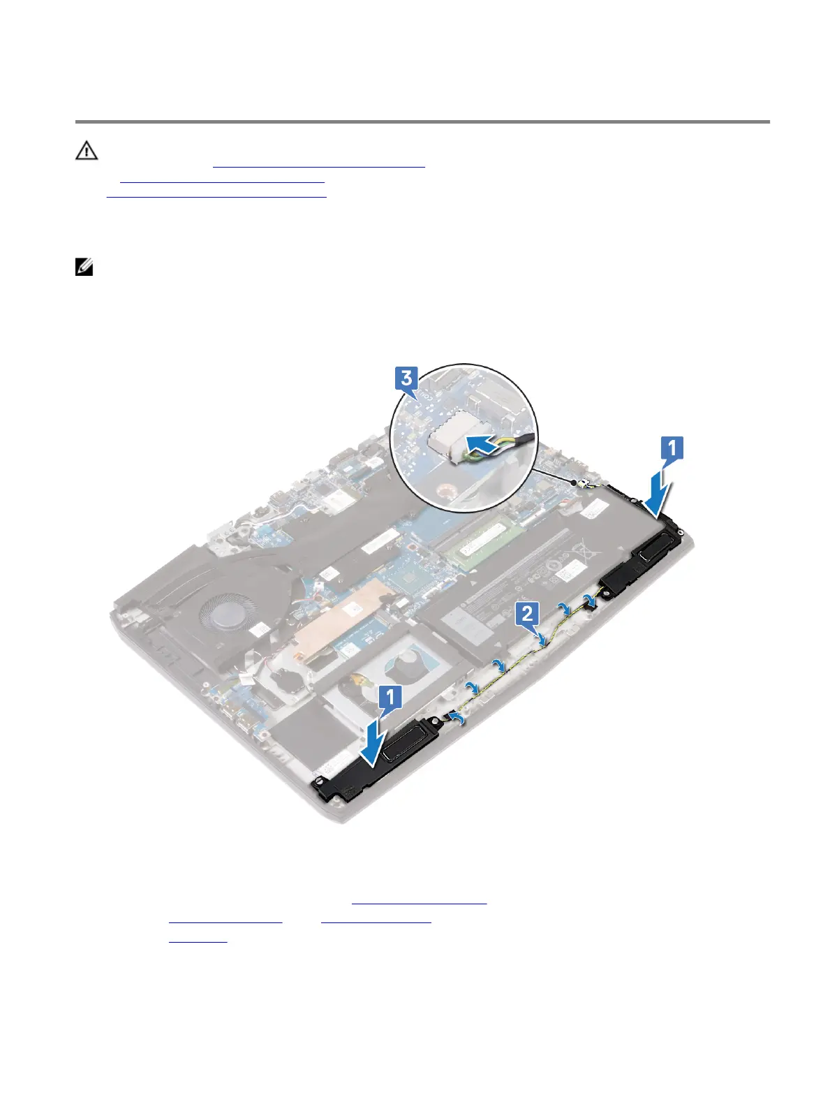 1 Using the alignment posts and rubber grommets, place the speakers in the slots on the palm-rest assembly.