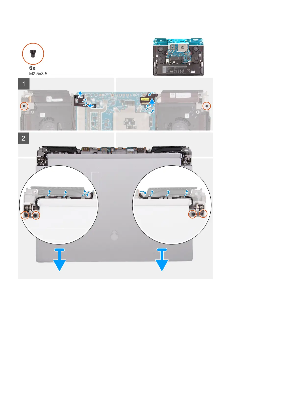 6. Remove the six screws (M2.5x3.5) that secure the display assembly to the palm-rest and keyboard assembly.