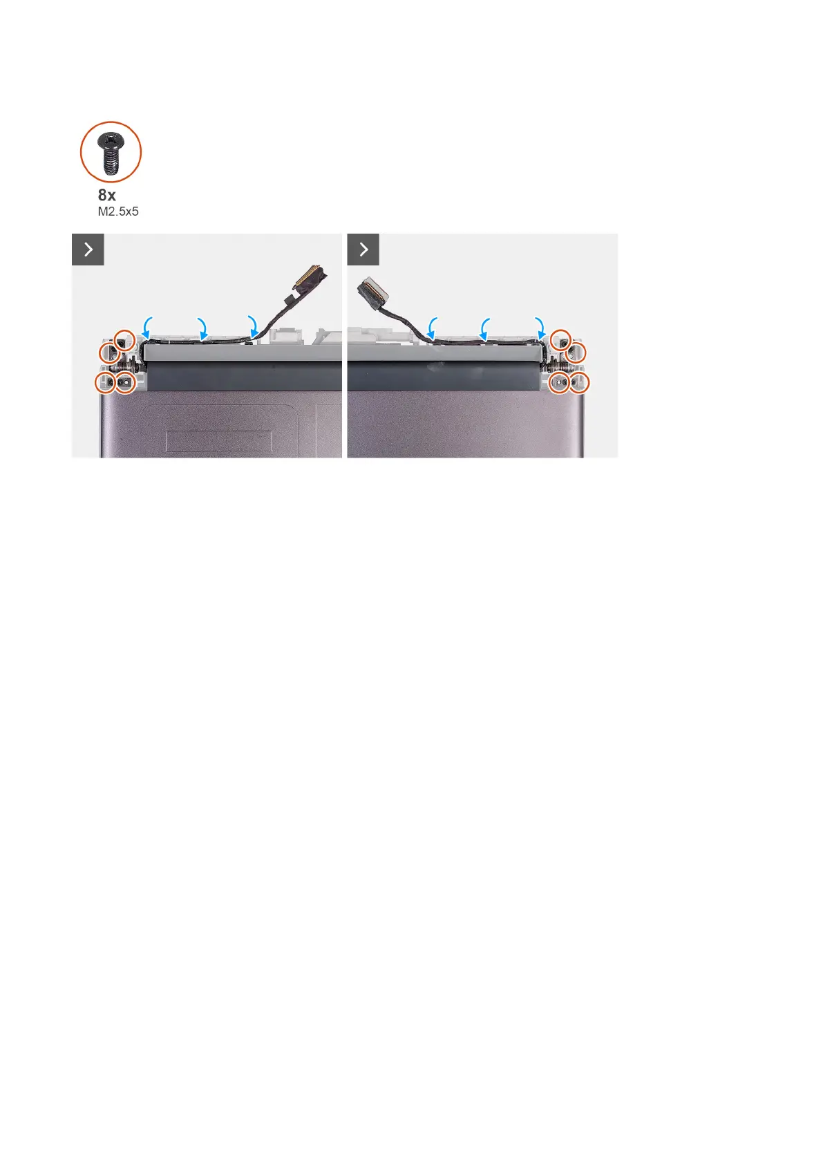 4. Replace the eight screws (M2.5x5) that secure display assembly to the palm-rest and keyboard assembly.