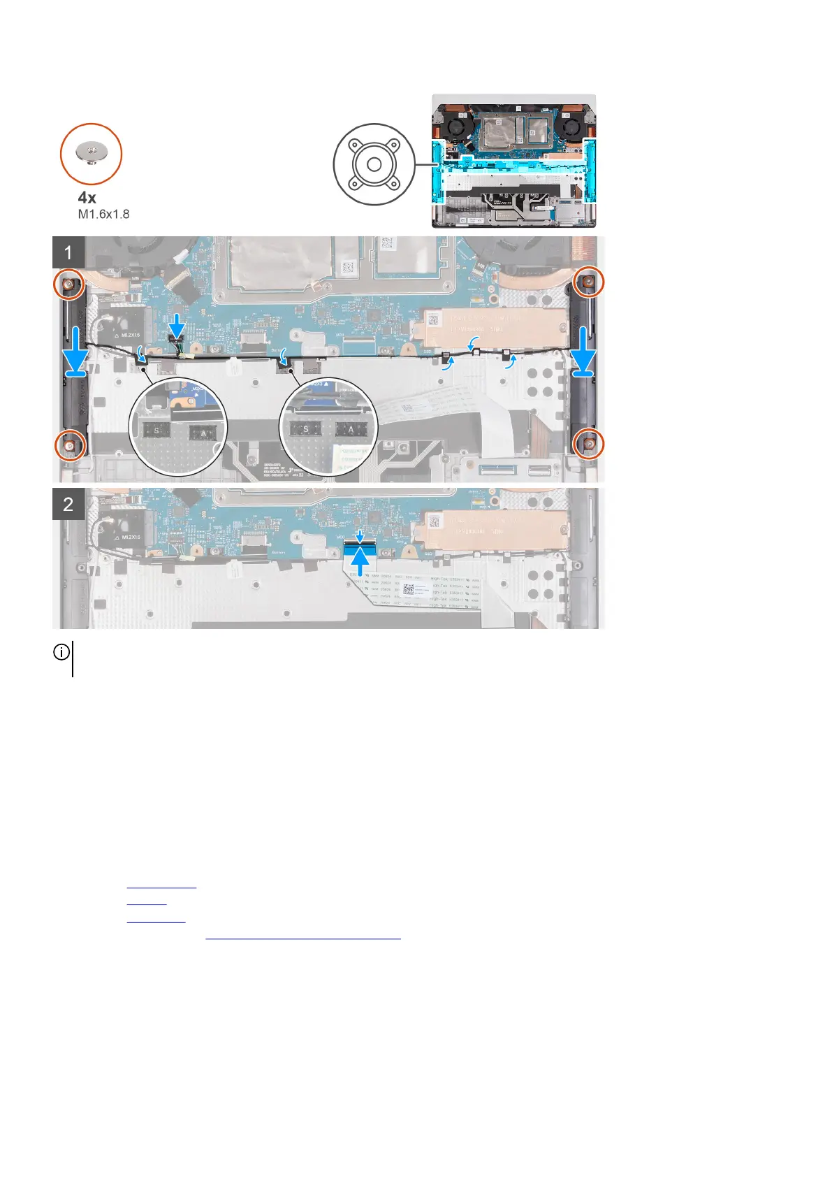 2. Replace the four screws (M1.6x1.8) that secure the left speaker and right speaker to the palm-rest and keyboard assembly.