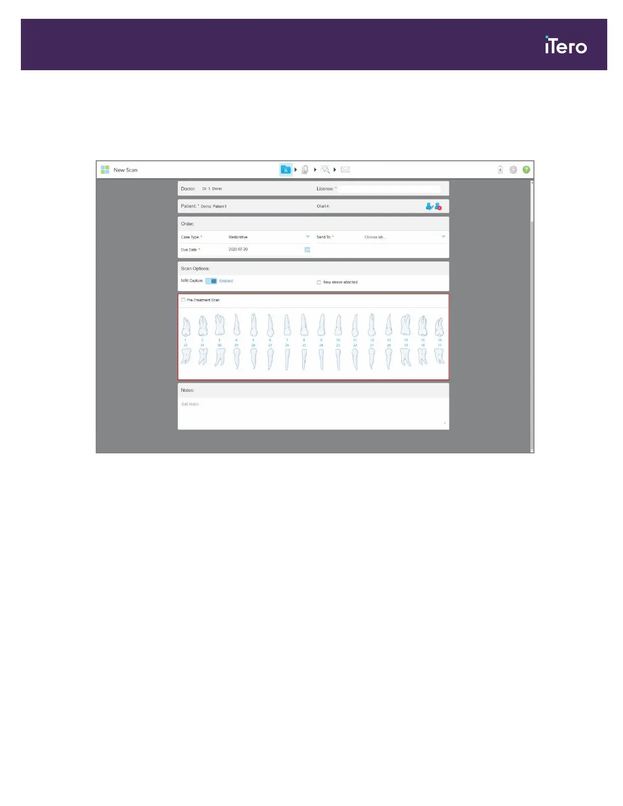 Figure 96: New Scan window – Restorative case type with a tooth chart