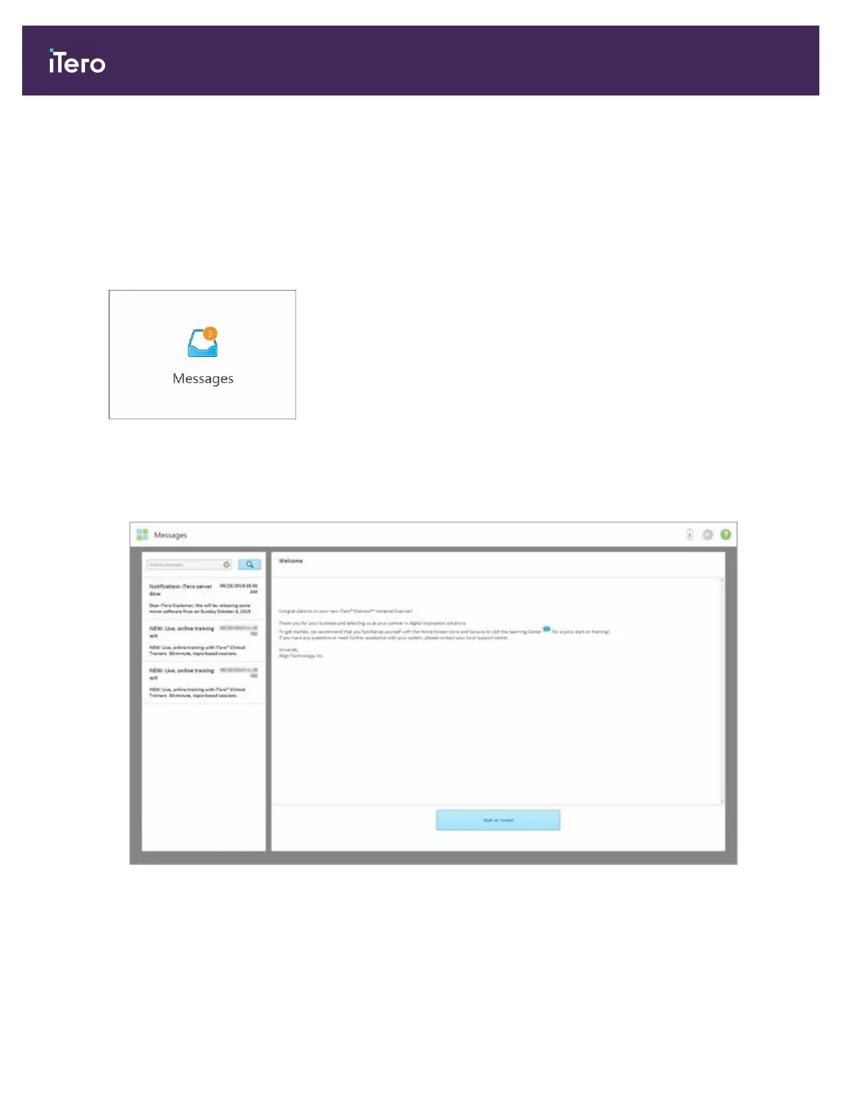 The Messages page displays notifications, updates, and other system messages from Align Technology, for
