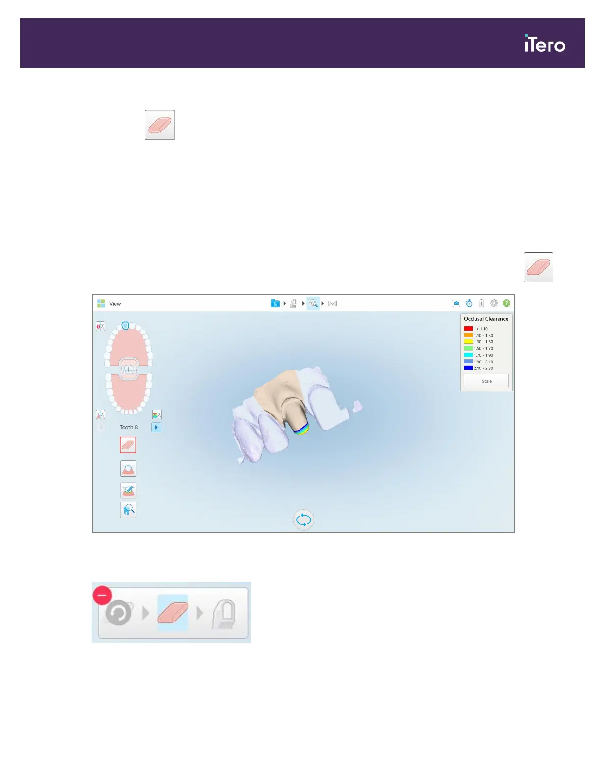 If the prepped tooth shows areas of red on the Occlusal Clearance legend, you can reduce the prepped tooth,