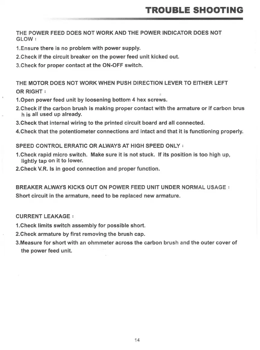BREAKER ALWAYS KICKS OUT ON POWER FEED UNIT UNDER NORMAL USAGE: