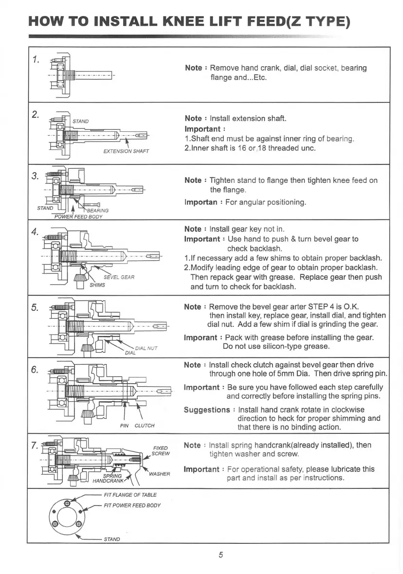 Note : Tighten stand to flange then tighten knee feed on