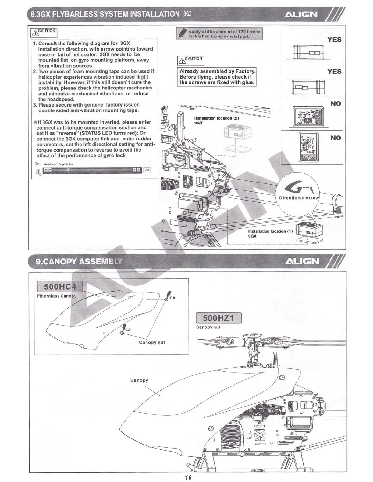 Align Super Combo TREX 500PRO DFC RH50E01XT - 8. 3 GX Flybarless System Installation; 3 GX Installation and Mounting; Canopy Assembly