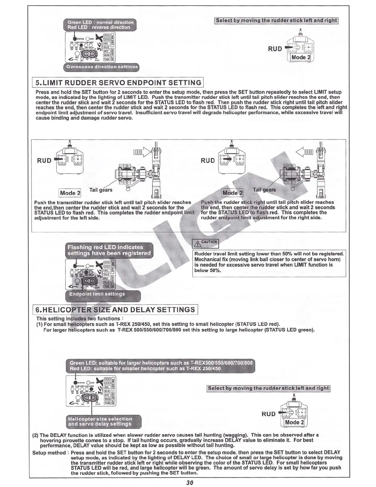 (2) The DELAY function is utilized when slower rudder servo causes tail hunting (wagging) . This can be observed after a