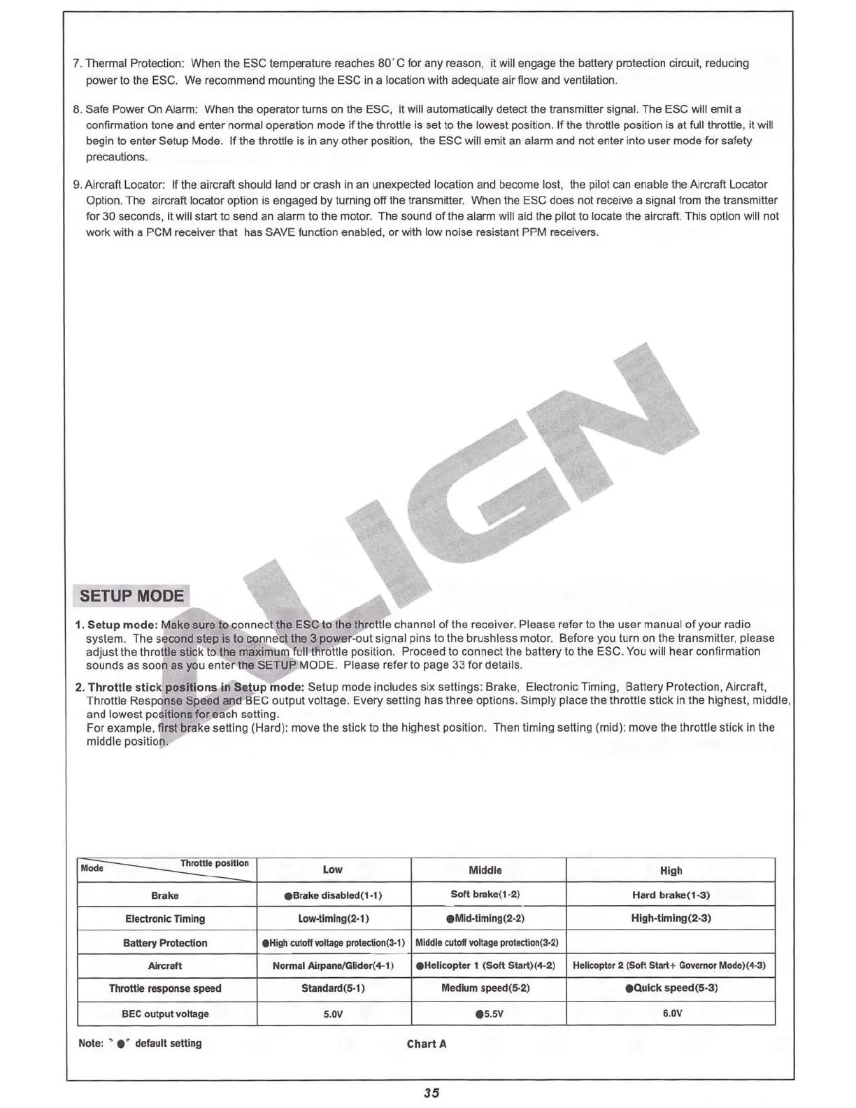 begin to enter Setup Mode. If the throttle is in any other position, the ESC will emit an alarm and not enter into user mode for saf