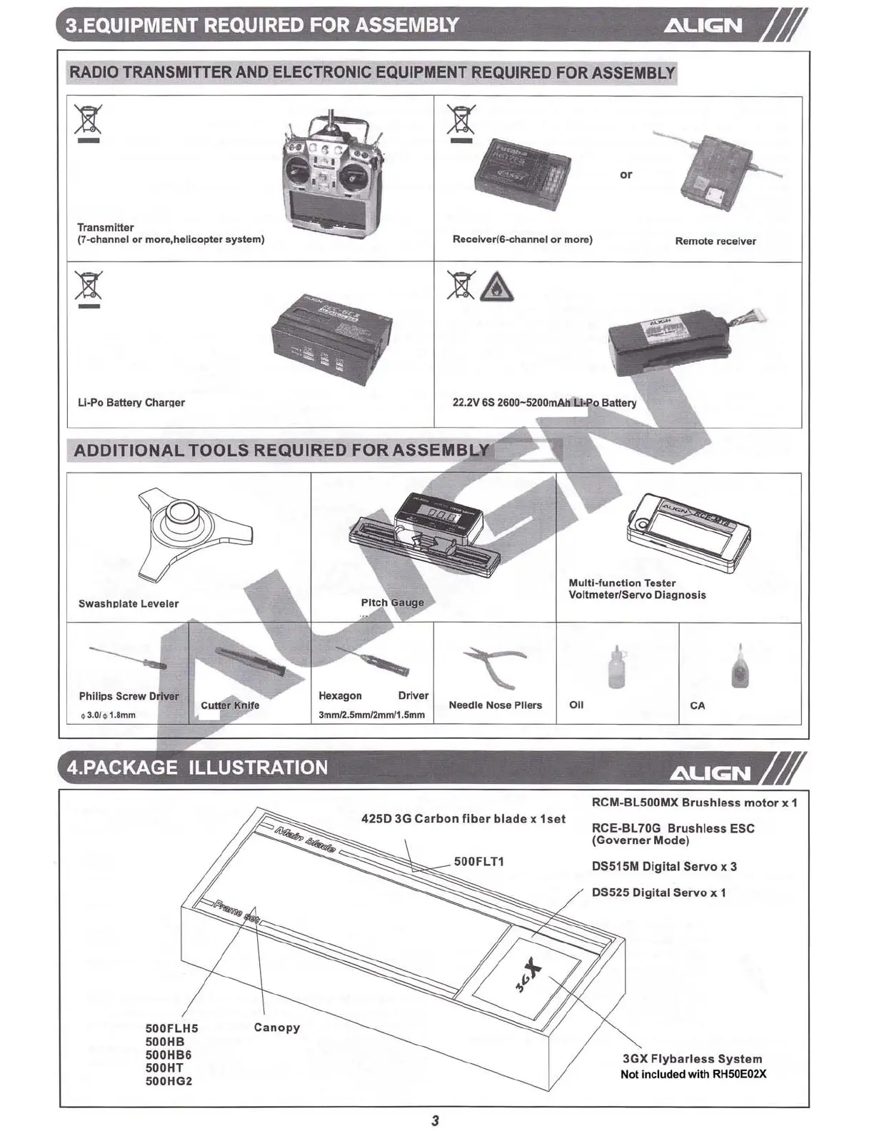 Align Super Combo TREX 500PRO DFC RH50E01XT - 3. Equipment Required for Assembly; Required Electronic Equipment; Additional Tools Required; 4. Package Illustration