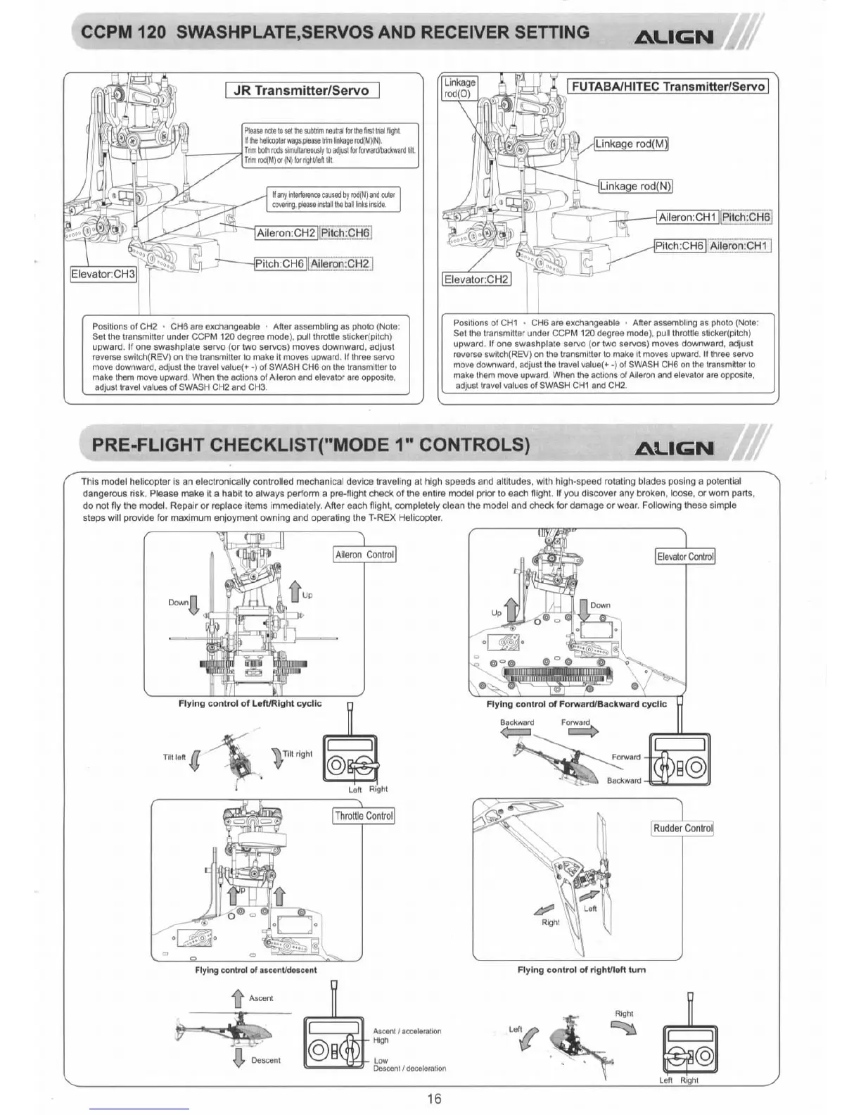 Align T-Rex 450 SE - CCPM 120 SWASHPLATE,SERVOS AND RECEIVER SETTING; PRE-FLIGHT CHECKLIST(MODE 1 CONTROLS)